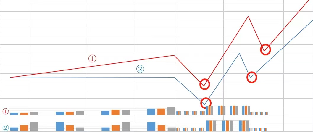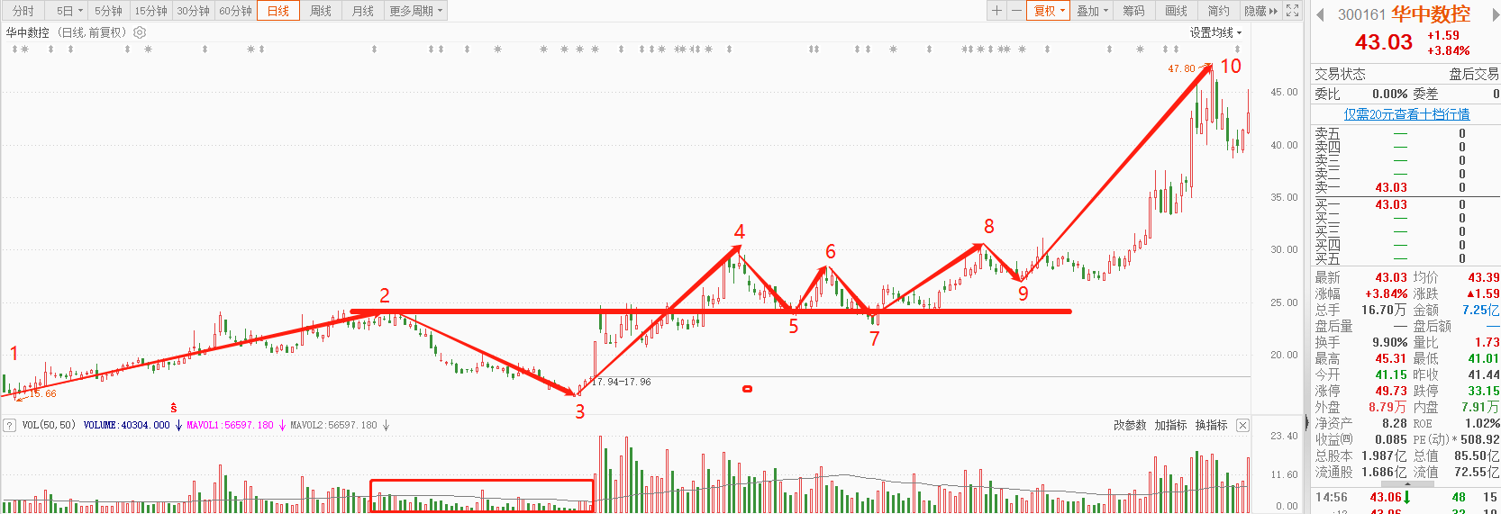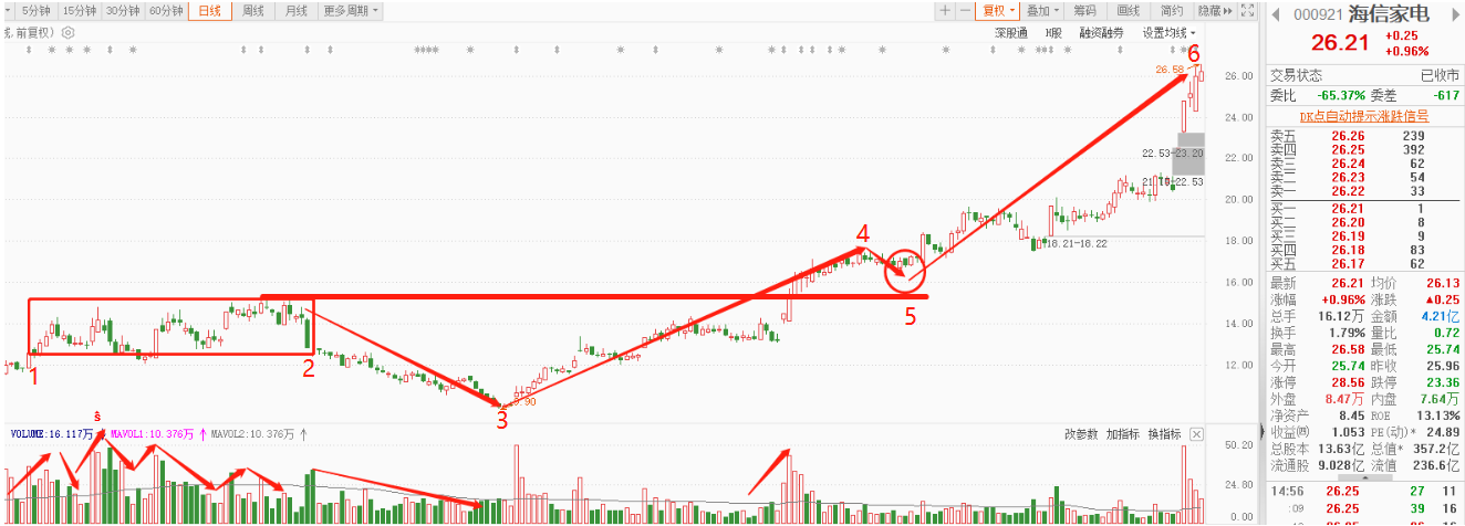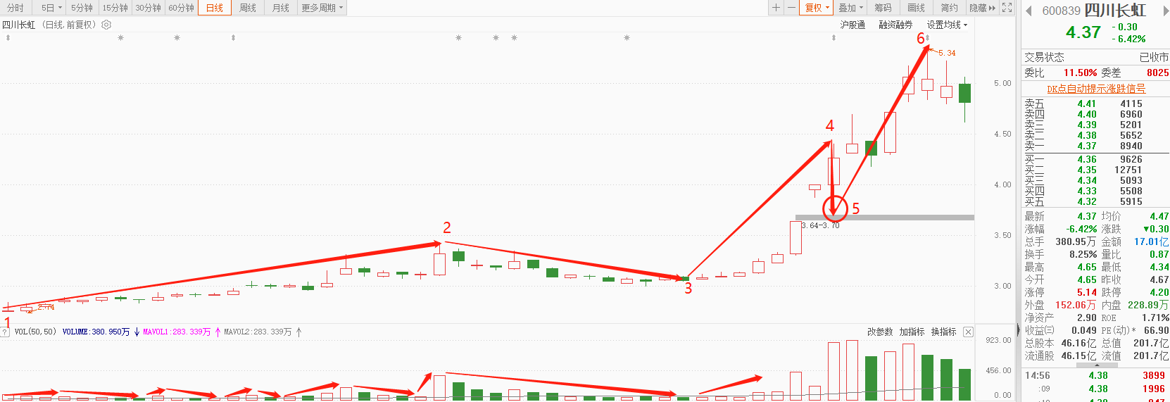 如上图,1-2为趋势上行,期间股价呈现出了有规律的变化,2-3持续缩量洗盘,然后3-4开启了一波放量突破上攻之势,4-5缩量回踩确实,开启下一波强势上涨走势。