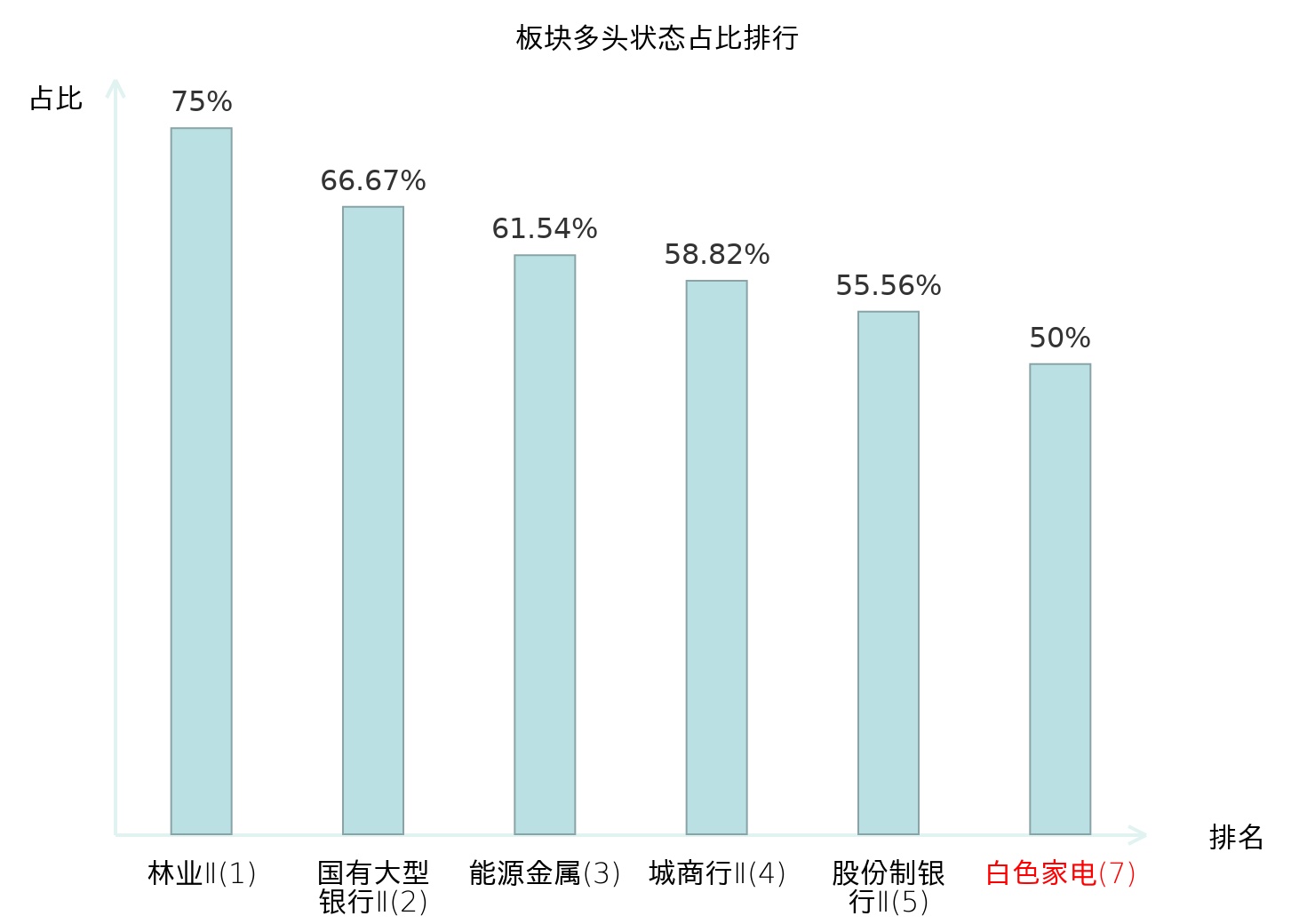 全市场所有行业板块中主力多头状态占比排名中,林业Ⅱ板块位居第一。专业连锁Ⅱ板块名次提升最快,较昨日上升63位。