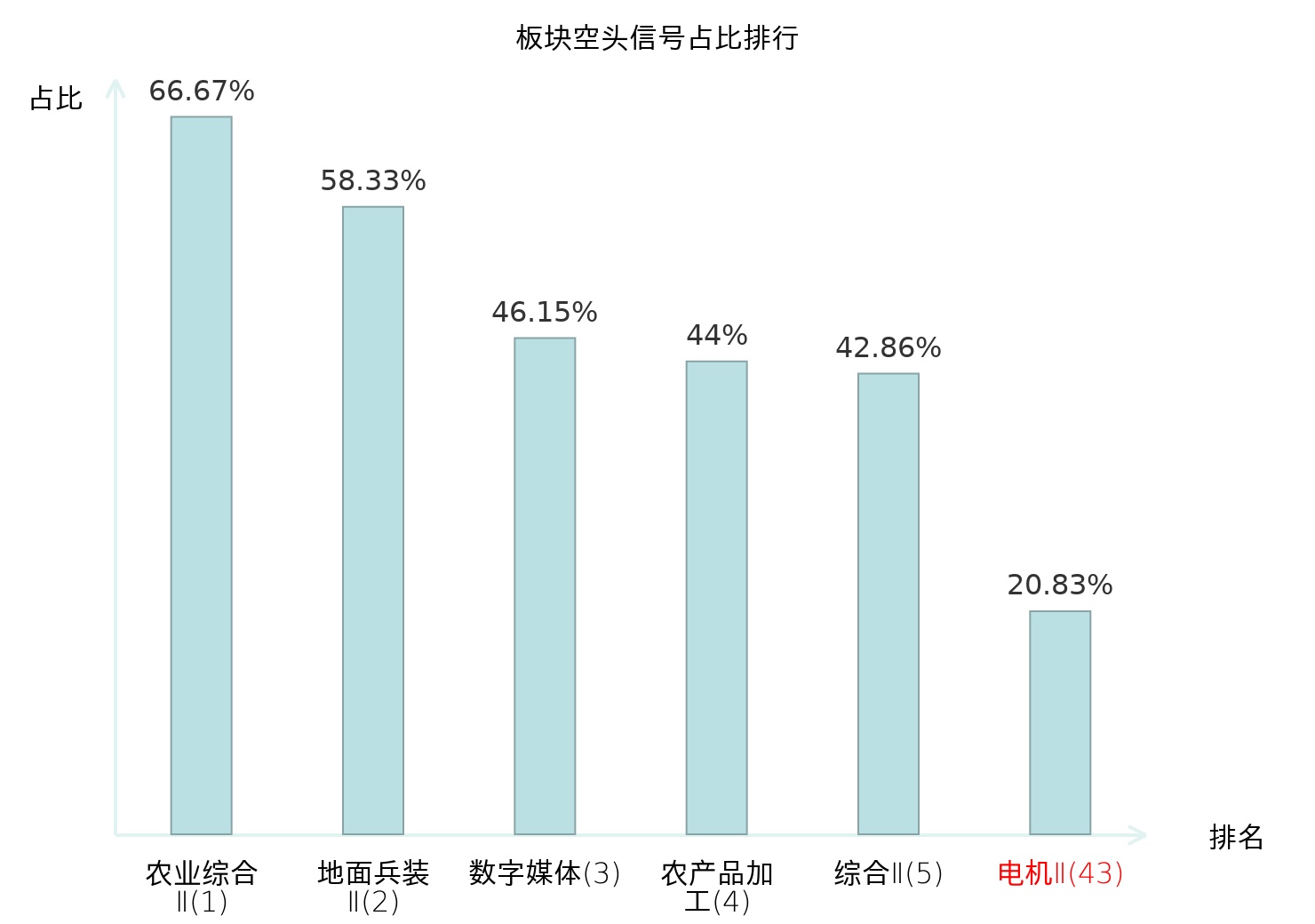 全市场所有行业板块中主力空头信号占比排名中,农业综合Ⅱ板块位居第一。医药商业板块名次提升最快,较昨日上升121位。