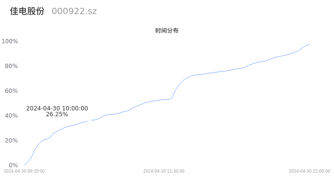 000922佳电股份2024年04月30日成交9.69万手,成交金额1.17亿元,相较昨日缩量6.60万手,换手率1.65%,成交清淡。