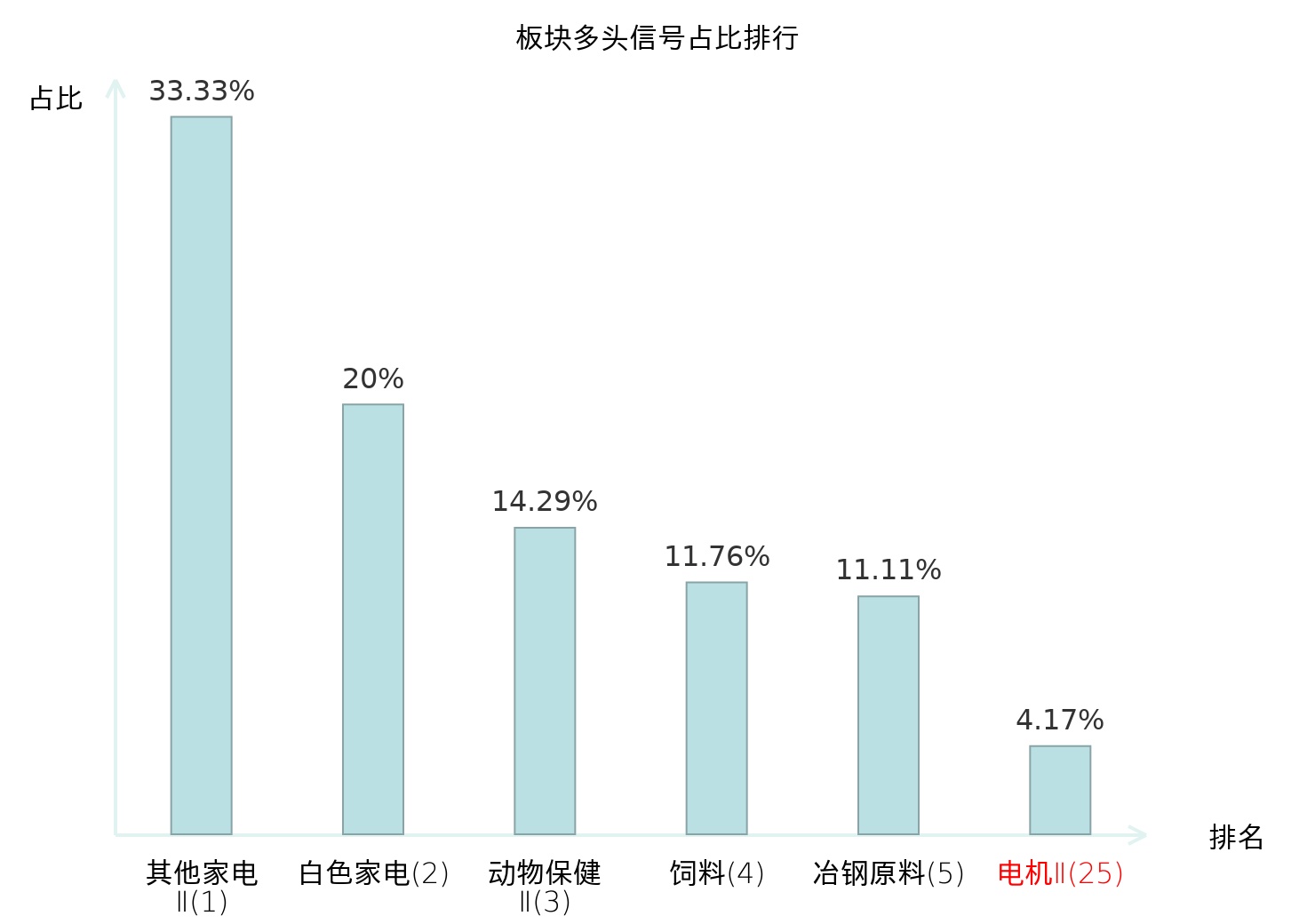 全市场所有行业板块中主力多头信号占比排名中,其他家电Ⅱ板块位居第一。其他家电Ⅱ板块名次提升最快,较昨日上升128位。