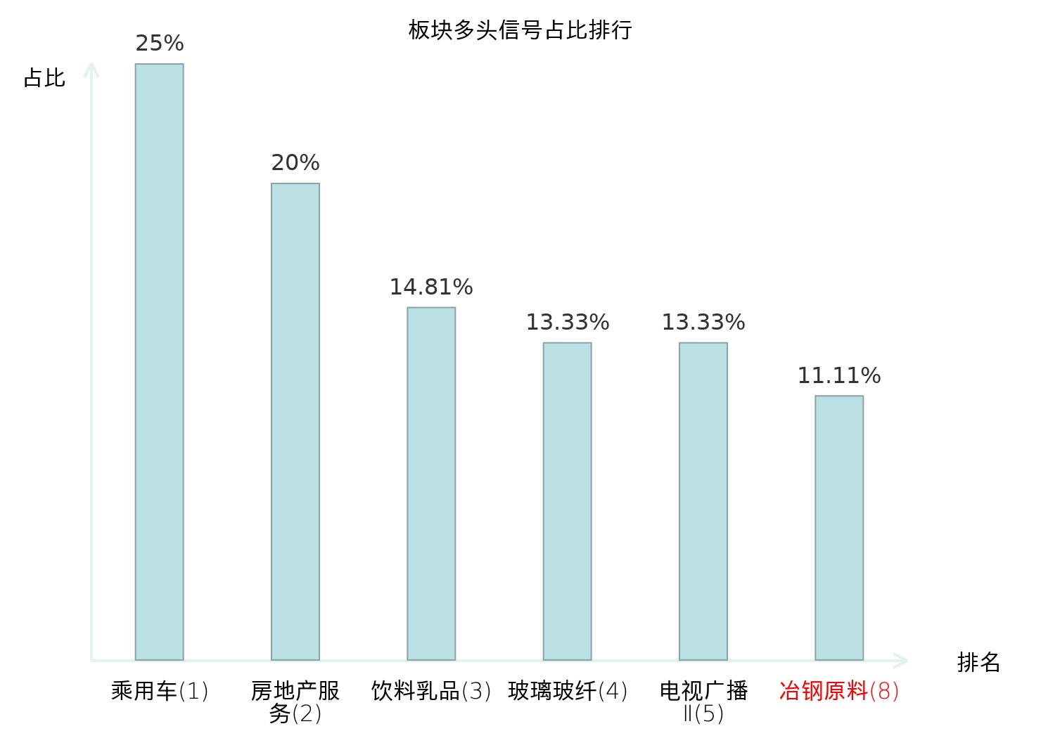 全市场所有行业板块中主力多头信号占比排名中,乘用车板块位居第一。乘用车板块名次提升最快,较昨日上升117位。