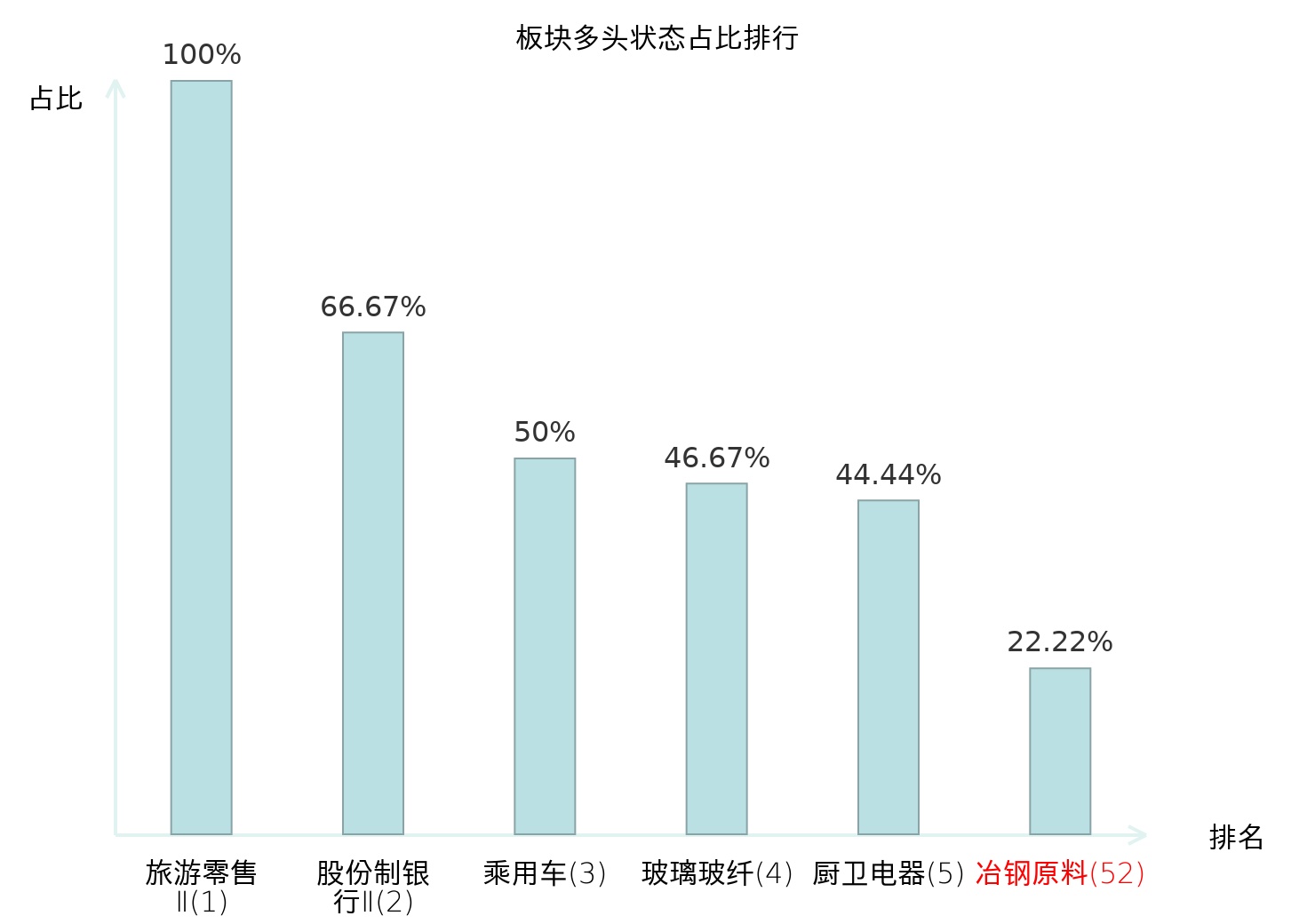 全市场所有行业板块中主力多头状态占比排名中,旅游零售Ⅱ板块位居第一。农产品加工板块名次提升最快,较昨日上升72位。