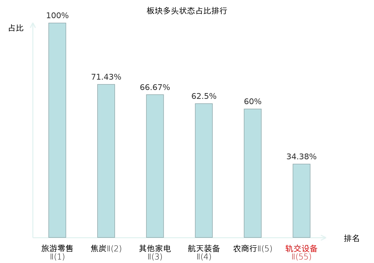 全市场所有行业板块中主力多头状态占比排名中,旅游零售Ⅱ板块位居第一。白酒Ⅱ板块名次提升最快,较昨日上升50位。