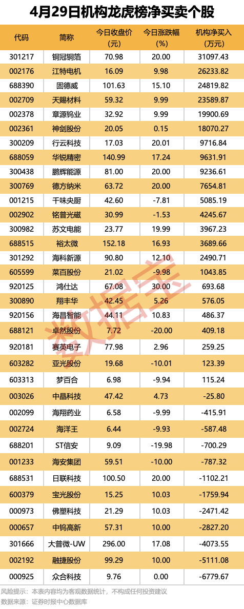 今日龙虎榜中,净买入个股为23只,净卖出的个股为12只。16股净买入金额均超千万元,铜冠铜箔获机构净买入3.11亿元,居首。江特电机、固德威和天赐材料获机构净买入金额均超2.3亿元。