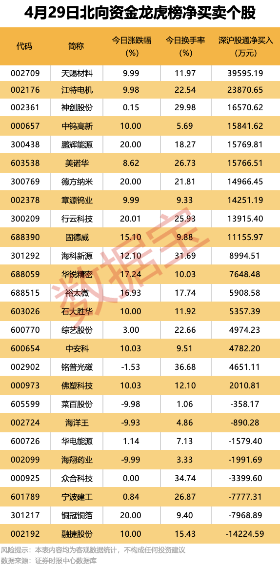 今日龙虎榜现身个股中,18股获北向资金净买入,其中10股净买入金额均超1亿元。天赐材料获北向资金净买入3.96亿元,居首;江特电机获净买入2.39亿元,居次席。