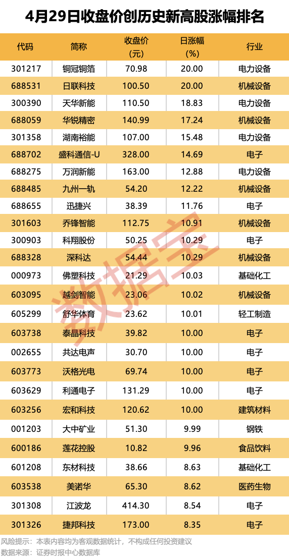 收盘价创历史新高股中,今日股价平均上涨6.23%,涨停的有铜冠铜箔、日联科技、佛塑科技等,涨幅居前的有天华新能、华锐精密、湖南裕能等。