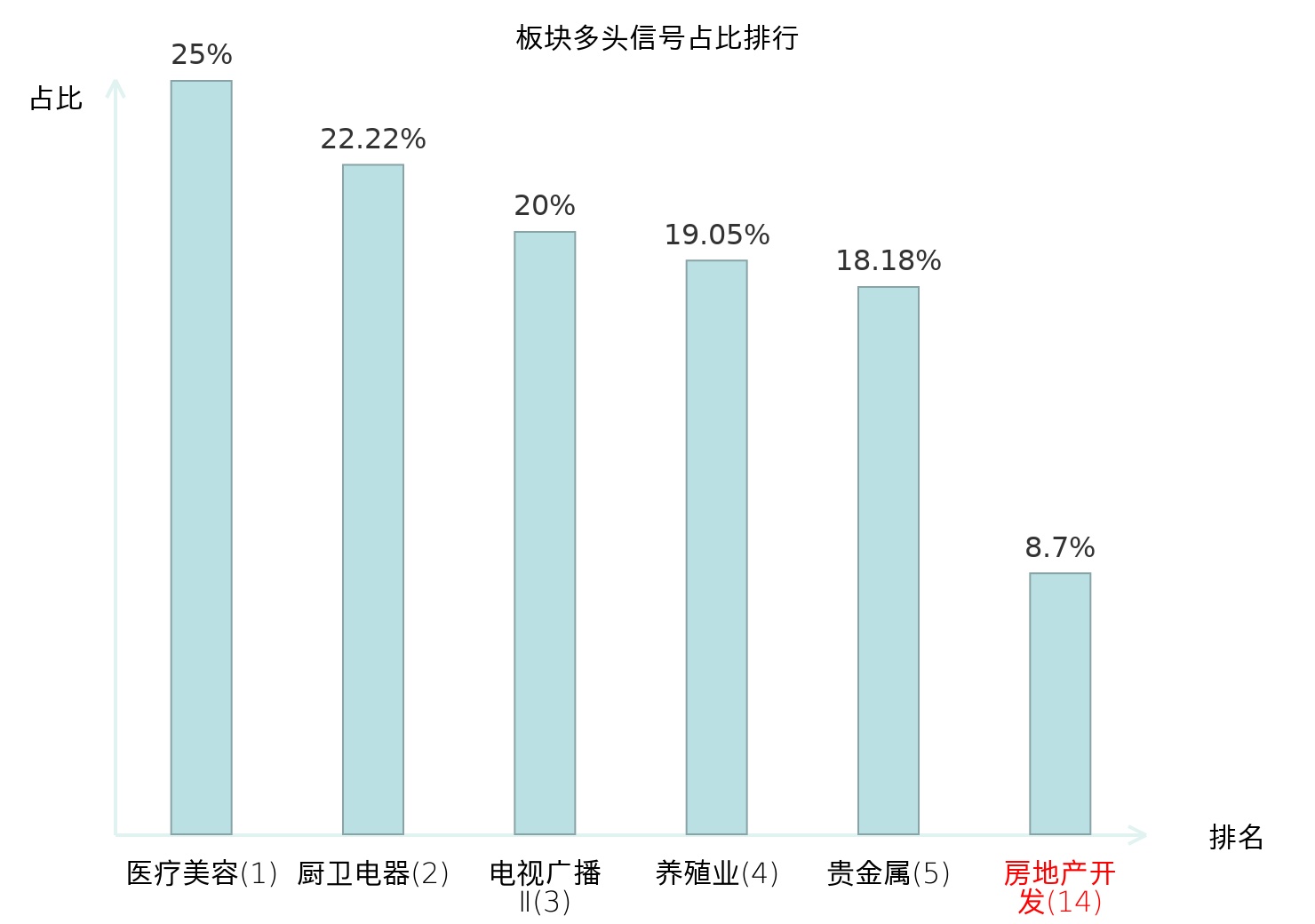 全市场所有行业板块中主力多头信号占比排名中,医疗美容板块位居第一。医疗美容板块名次提升最快,较昨日上升126位。