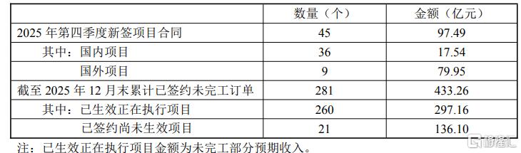 2025 年全年公司新签项目合同总金额 203.98 亿元,其中国外项目合同总金额 145.90 亿元,国内项目合同总金额 58.08 亿元。