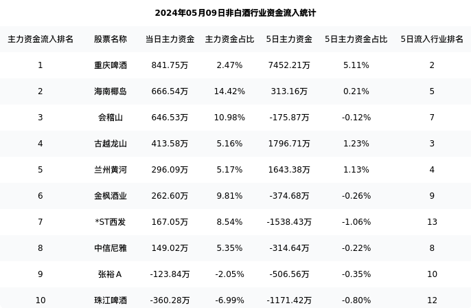 从主力资金流向来看,非白酒行业今日主力资金流入5.72亿元,在所有申万二级行业中排名:111/131。