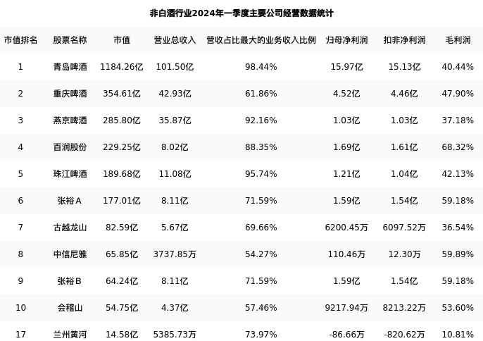 兰州黄河最新报告期数据为一季度,下表汇总了非白酒行业内市值靠前的公司一季度主要经营数据