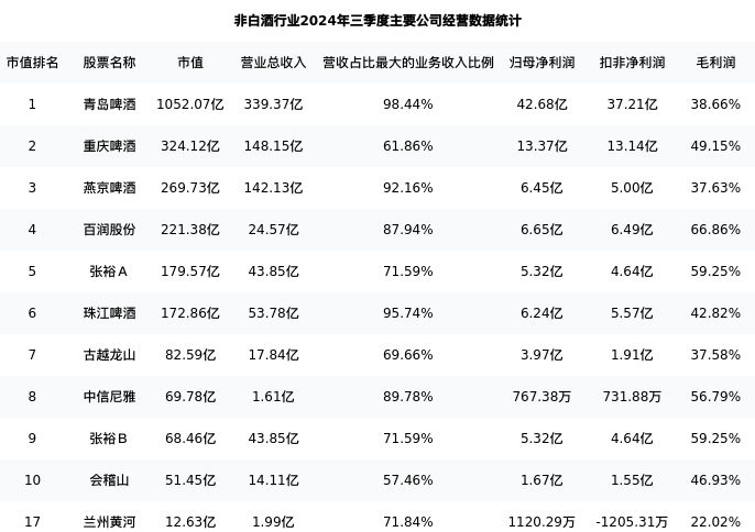 兰州黄河最新报告期数据为三季度,下表汇总了非白酒行业内市值靠前的公司三季度主要经营数据