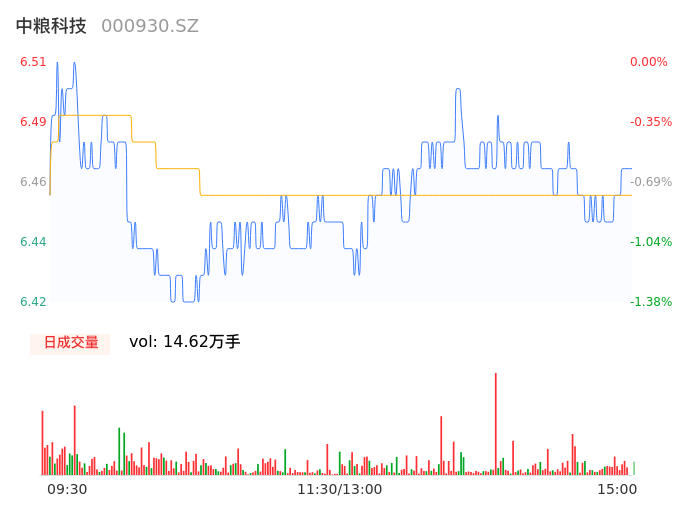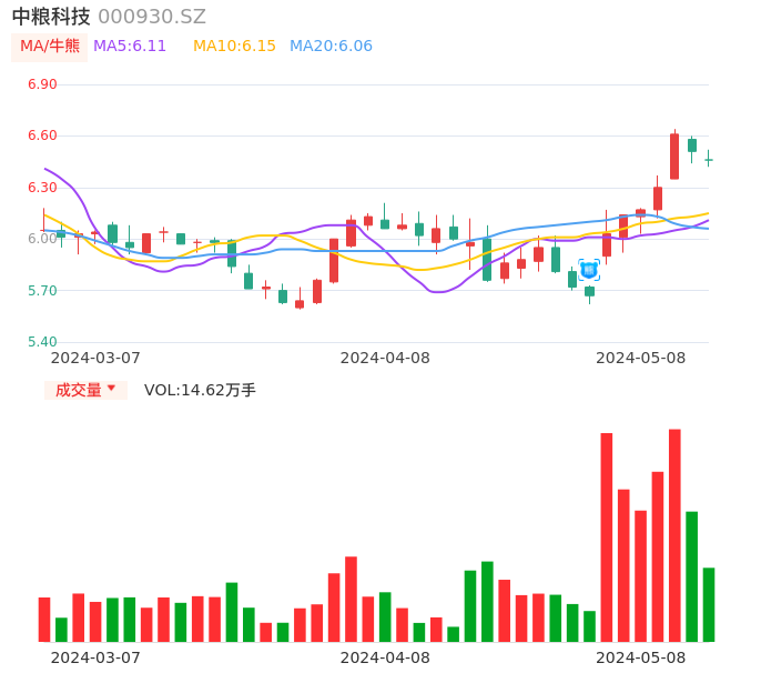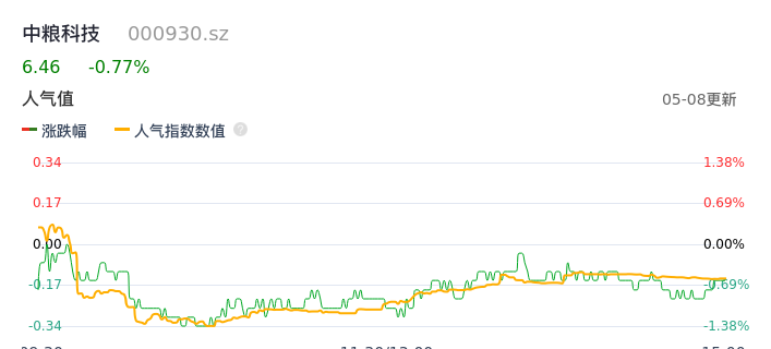 05月08日,中粮科技收报6.46,股价涨幅-0.77%,成交金额9446.36万元,换手率0.79%。