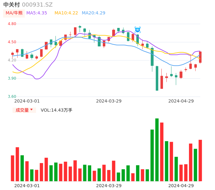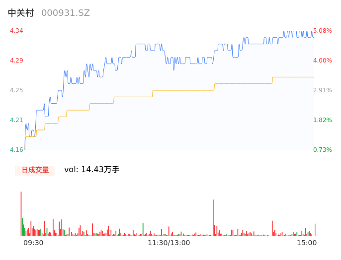 04月29日,中关村收报4.34,股价涨幅5.08%,成交金额6164.48万元,换手率1.93%。