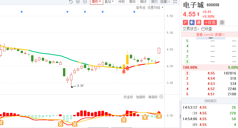 2)电子城-四维操盘-近期出现火箭信号且底部量柱由绿转红