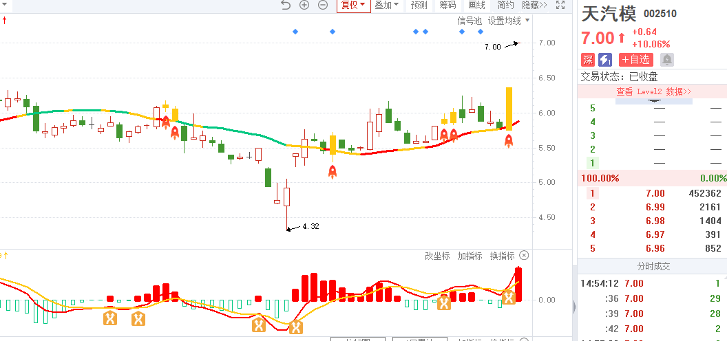 1)天汽模-四维操盘-近期出现火箭信号且底部量柱由绿转红