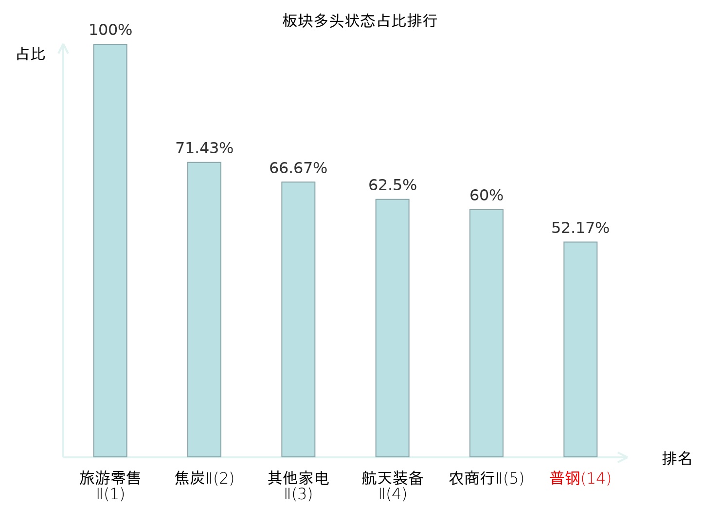全市场所有行业板块中主力多头状态占比排名中,旅游零售Ⅱ板块位居第一。白酒Ⅱ板块名次提升最快,较昨日上升50位。