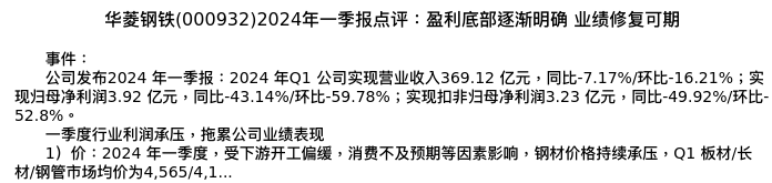 值得注意的是:2024年05月华福证券的王保庆分析师,首次发布关于华菱钢铁的研究报告,标题为:华菱钢铁(000932)2024年一季报点评:盈利底部逐渐明确 业绩修复可期。