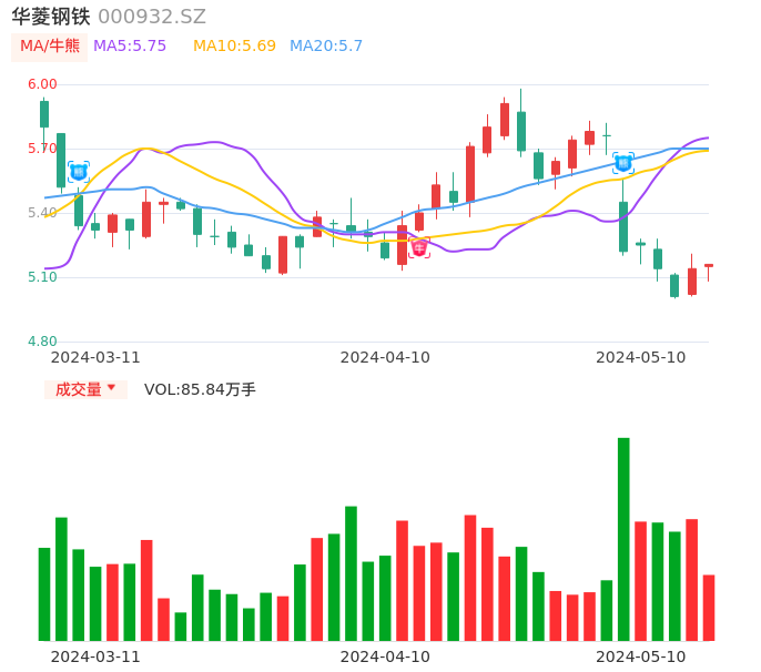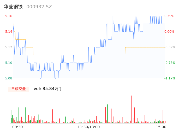 05月10日,华菱钢铁收报5.16,股价涨幅0.39%,成交金额4.40亿元,换手率1.24%。