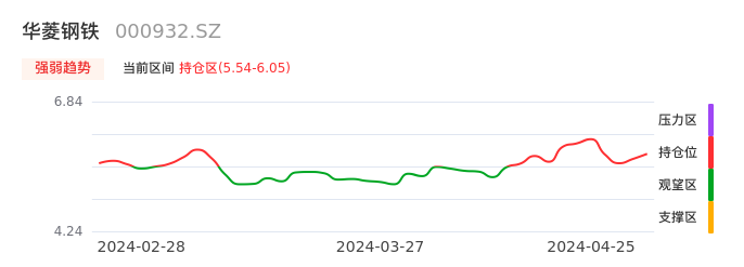 我们来看一下该股的九方特色指标强弱趋势的情况:华菱钢铁自04月12日从观望区上穿到持仓区。股价近期在多头区域持续强势上扬,上升动能仍较为充足,可积极关注。后续重点关注上方压力位:6.05元是否能突破上攻。