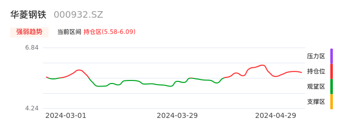 我们来看一下该股的九方特色指标强弱趋势的情况:华菱钢铁自04月12日从观望区上穿到持仓区。股价近期在多头区域回调整理。后续重点关注多空分界点的争夺:5.58元。如未能有效站稳则可能重新回到空头行情。