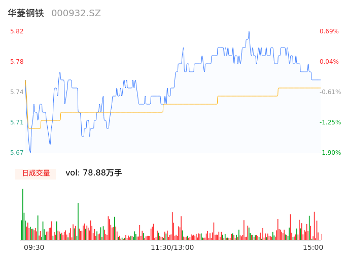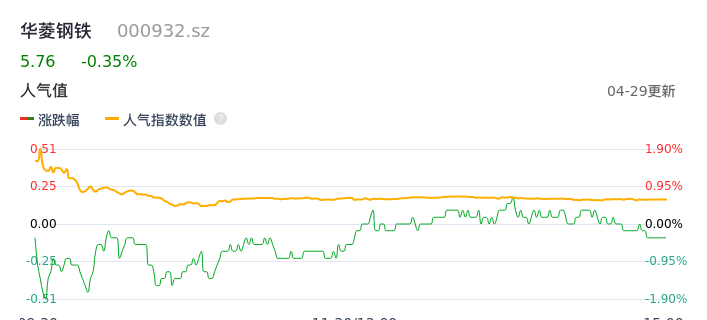 04月29日,华菱钢铁收报5.76,股价涨幅-0.35%,成交金额4.54亿元,换手率1.14%。