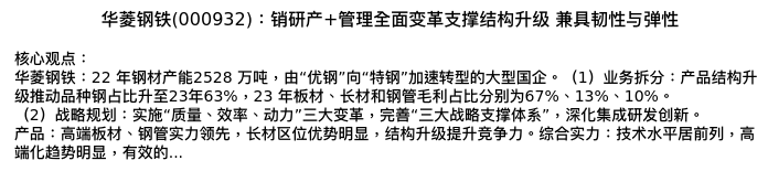 值得注意的是:2024年04月广发证券的李莎/宫帅分析师,首次发布关于华菱钢铁的研究报告,标题为:华菱钢铁(000932):销研产+管理全面变革支撑结构升级 兼具韧性与弹性。