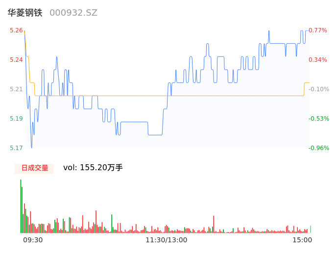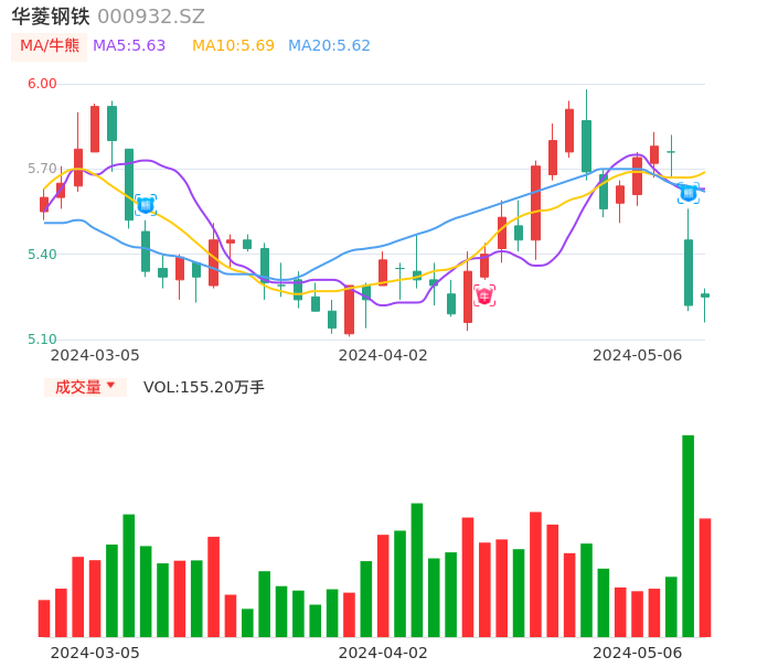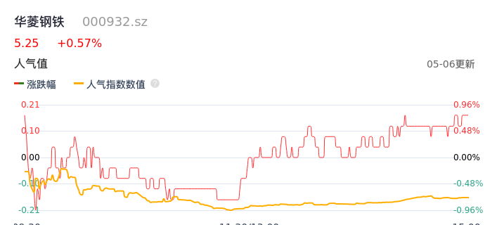 05月06日,华菱钢铁收报5.25,股价涨幅0.57%,成交金额8.09亿元,换手率2.25%。