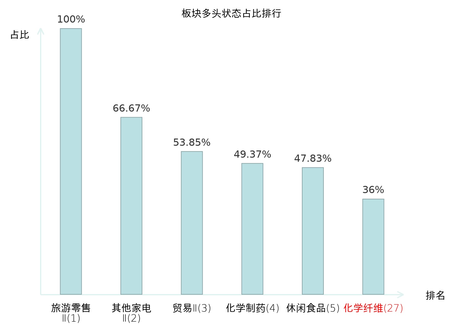 全市场所有行业板块中主力多头状态占比排名中,旅游零售Ⅱ板块位居第一。互联网电商板块名次提升最快,较昨日上升55位。