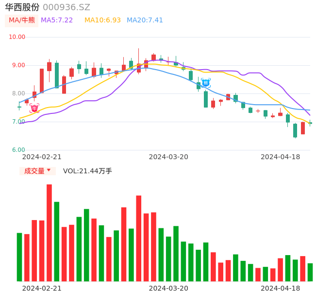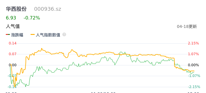 04月18日,华西股份收报6.93,股价涨幅-0.72%,成交金额1.49亿元,换手率2.42%。
