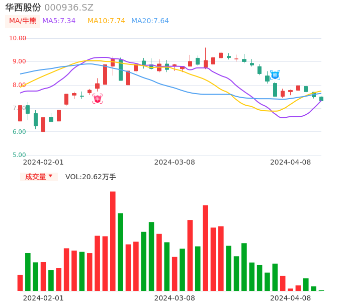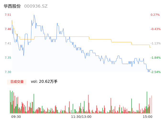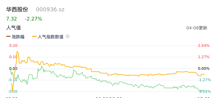 04月08日,华西股份收报7.32,股价涨幅-2.27%,成交金额1.52亿元,换手率2.33%。