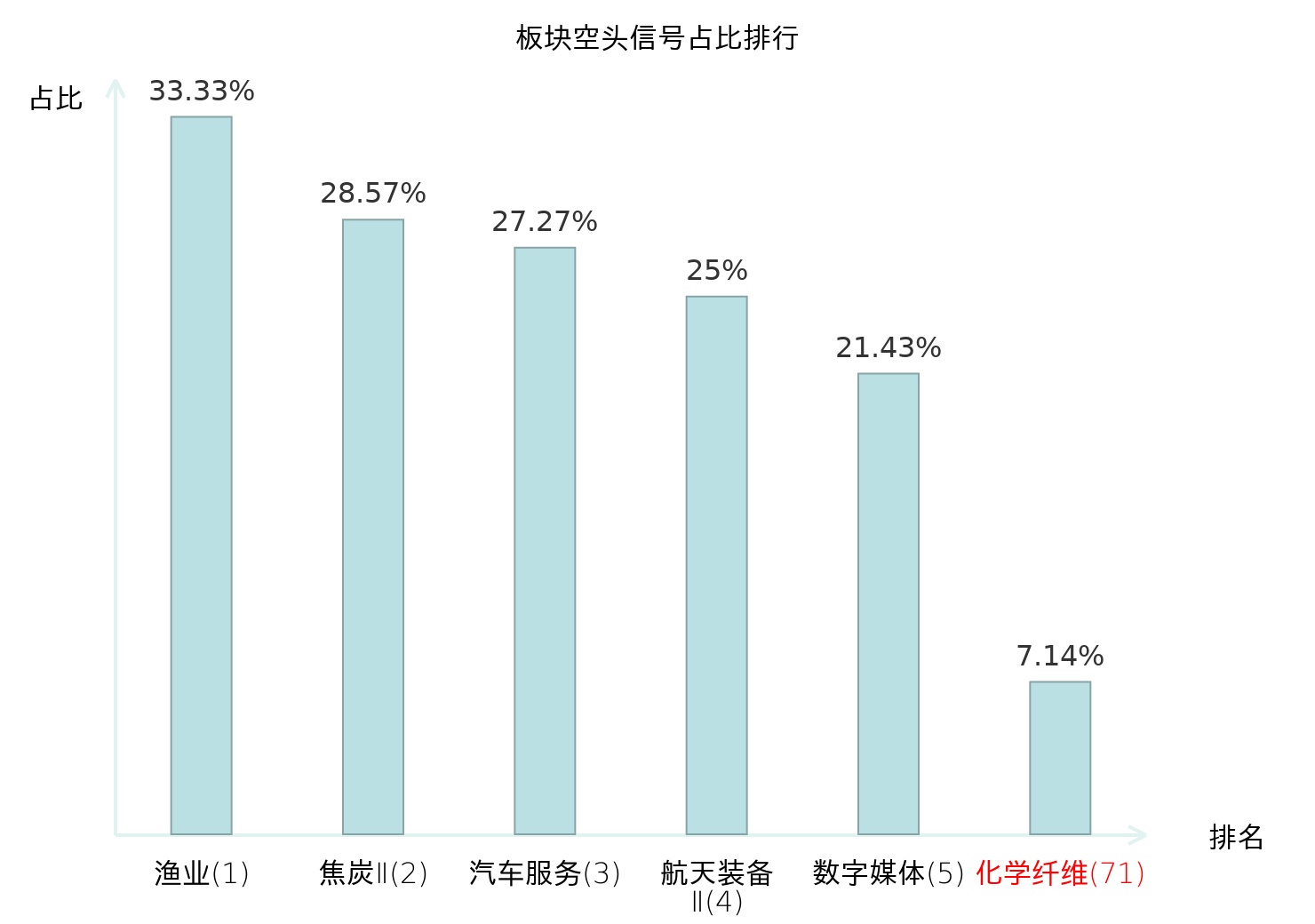 全市场所有行业板块中主力空头信号占比排名中,渔业板块位居第一。电子化学品Ⅱ板块名次提升最快,较昨日上升116位。