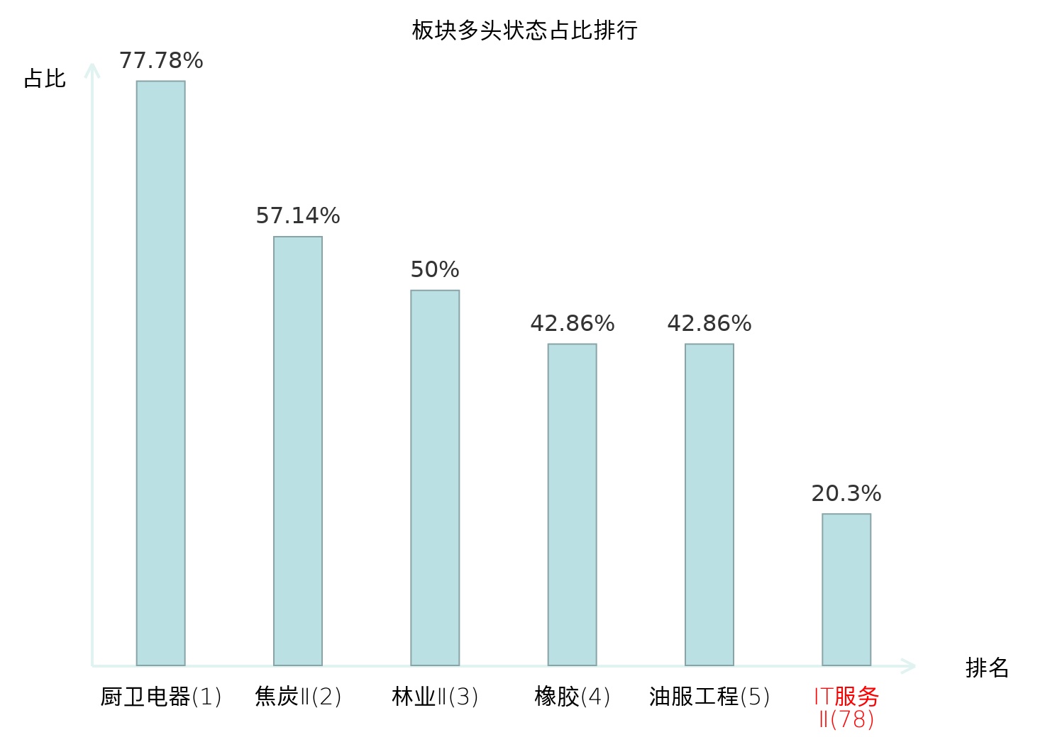全市场所有行业板块中主力多头状态占比排名中,厨卫电器板块位居第一。影视院线板块名次提升最快,较昨日上升88位。