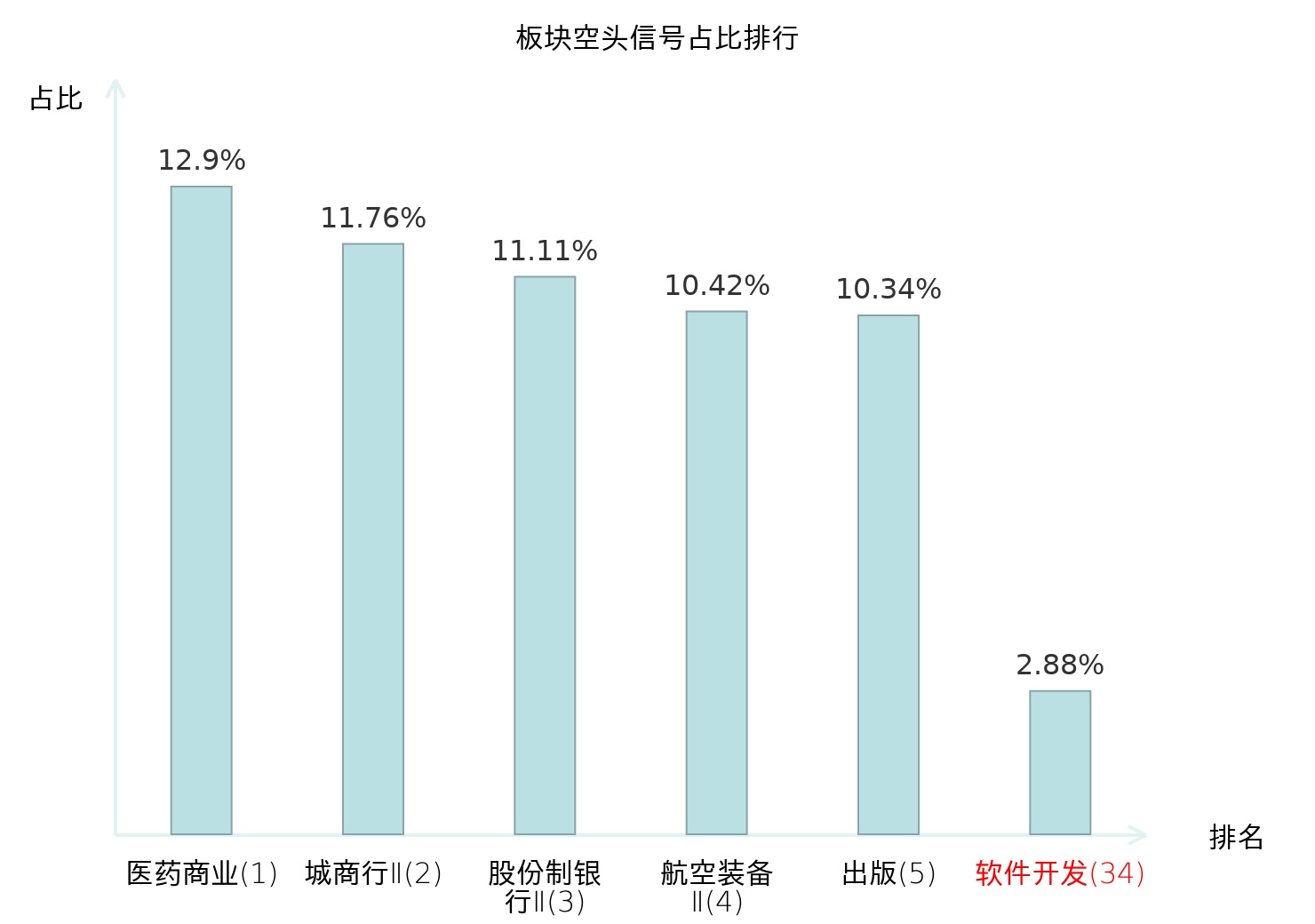 全市场所有行业板块中主力空头信号占比排名中,医药商业板块位居第一。城商行Ⅱ板块名次提升最快,较昨日上升102位。