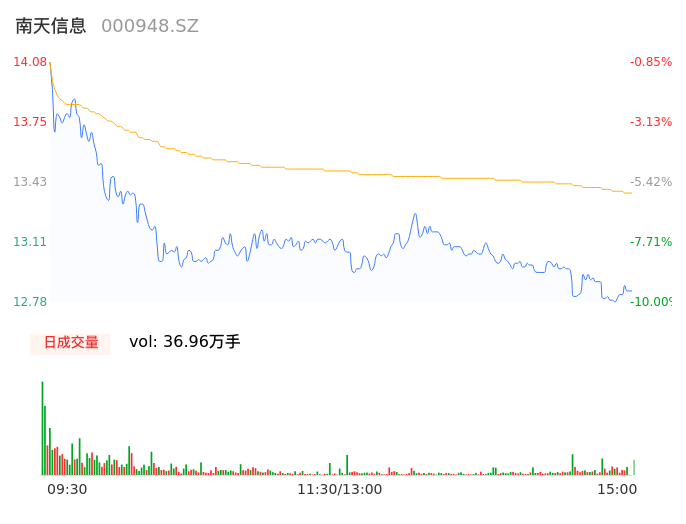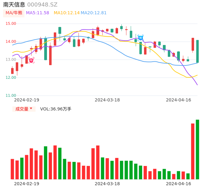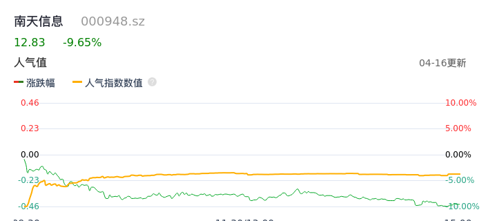 04月16日,南天信息收报12.83,股价涨幅-9.65%,成交金额4.94亿元,换手率9.58%。