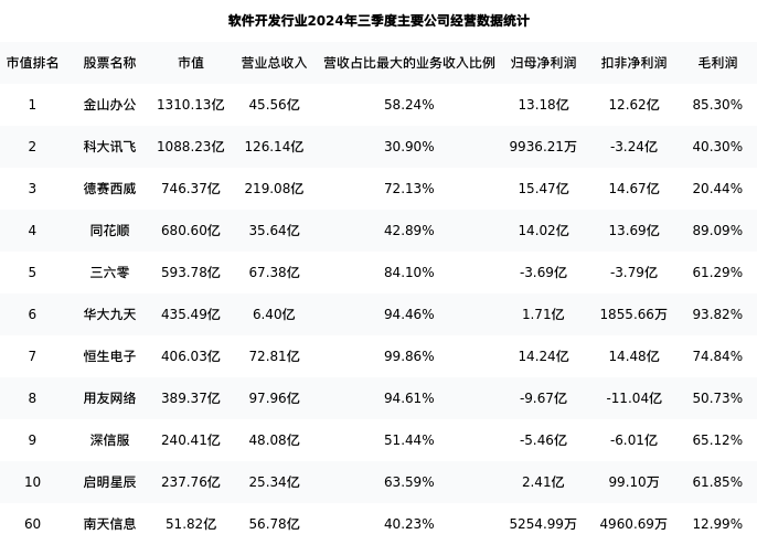 南天信息最新报告期数据为三季度,下表汇总了软件开发行业内市值靠前的公司三季度主要经营数据