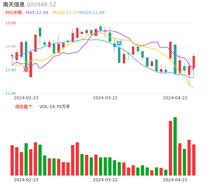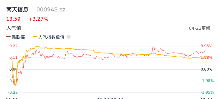 04月22日,南天信息收报13.59,股价涨幅3.27%,成交金额2.64亿元,换手率5.10%。