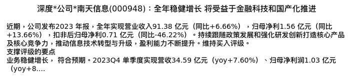 值得注意的是:2024年04月中银证券的杨思睿/刘桐彤分析师,首次发布关于南天信息的研究报告,标题为:深度*公司*南天信息(000948):全年稳健增长 将受益于金融科技和国产化推进。