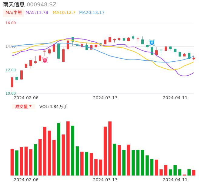 04月11日,南天信息收报13.03,股价涨幅0.54%,成交金额6331.06万元,换手率1.25%。