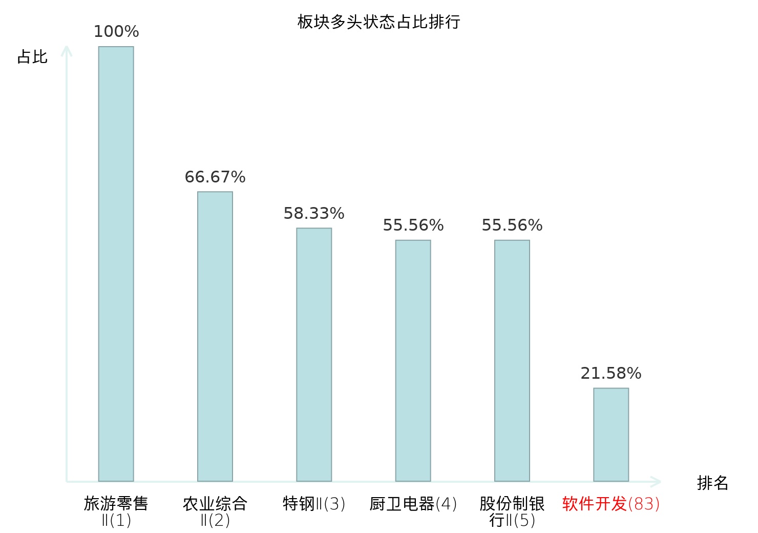 全市场所有行业板块中主力多头状态占比排名中,旅游零售Ⅱ板块位居第一。农业综合Ⅱ板块名次提升最快,较昨日上升127位。