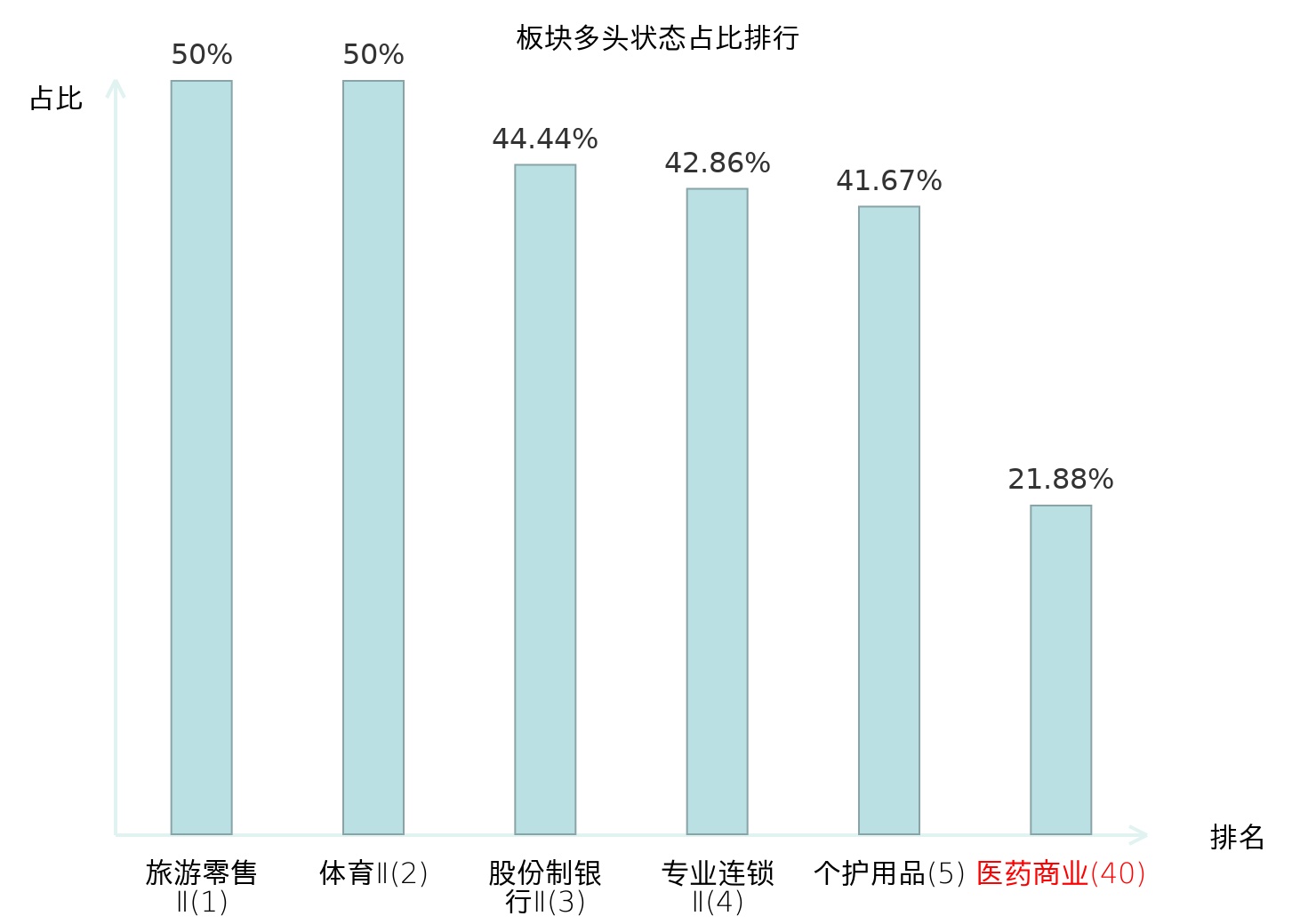 全市场所有行业板块中主力多头状态占比排名中,旅游零售Ⅱ板块位居第一。贵金属板块名次提升最快,较昨日上升83位。