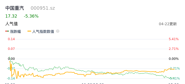 04月22日,中国重汽收报17.32,股价涨幅-5.36%,成交金额4.16亿元,换手率2.00%。