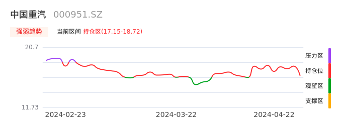 我们来看一下该股的九方特色指标强弱趋势的情况:中国重汽自04月11日从观望区上穿到持仓区。股价近期在多头区域回调整理。后续重点关注多空分界点的争夺:17.15元。如未能有效站稳则可能重新回到空头行情。