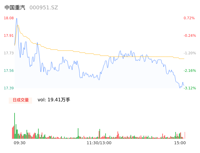 04月16日,中国重汽收报17.42,股价涨幅-2.95%,成交金额3.43亿元,换手率1.65%。