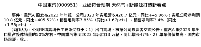值得注意的是:2024年04月西部证券的齐天翔分析师,首次发布关于中国重汽的研究报告,标题为:中国重汽(000951):业绩符合预期 天然气+新能源打造新看点。