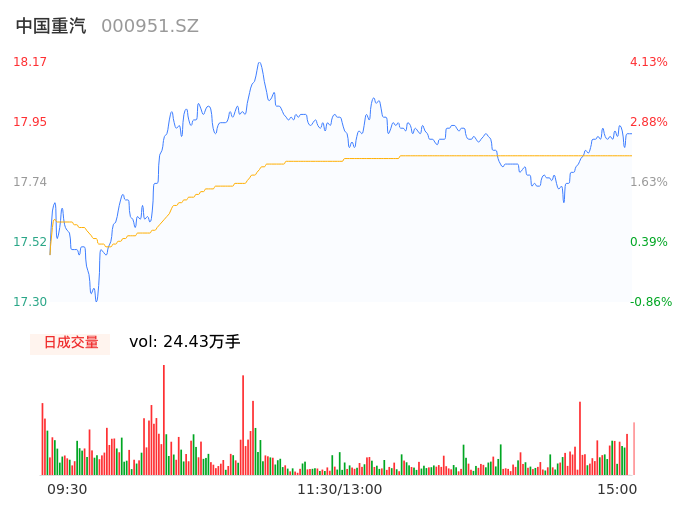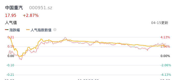 04月15日,中国重汽收报17.95,股价涨幅2.87%,成交金额4.36亿元,换手率2.08%。