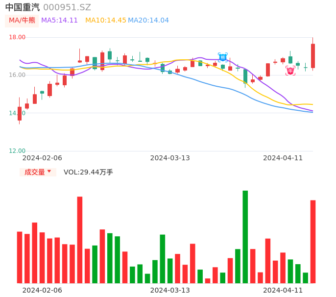 值得注意的是:2024年04月西部证券的齐天翔分析师,首次发布关于中国重汽的研究报告,标题为:中国重汽(000951):业绩符合预期 天然气+新能源打造新看点。