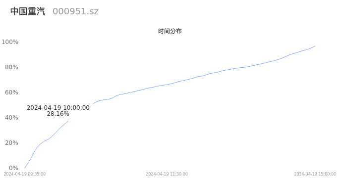 000951中国重汽2024年04月19日成交23.58万手,成交金额4.30亿元,相较昨日放量3.56万手,换手率2.01%,成交清淡。