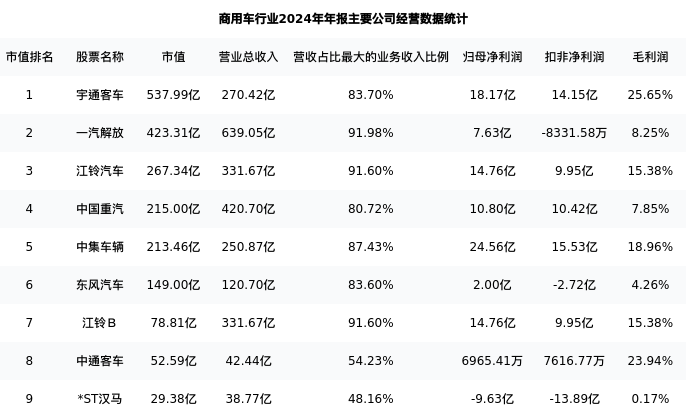 中国重汽最新报告期数据为年报,下表汇总了商用车行业内市值靠前的公司年报主要经营数据