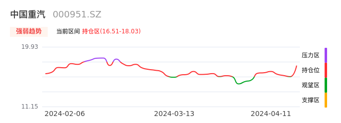 我们来看一下该股的九方特色指标强弱趋势的情况:中国重汽自04月01日从观望区上穿到持仓区。股价近期在多头区域持续强势上扬,上升动能仍较为充足,可积极关注。后续重点关注上方压力位:18.03元是否能突破上攻。